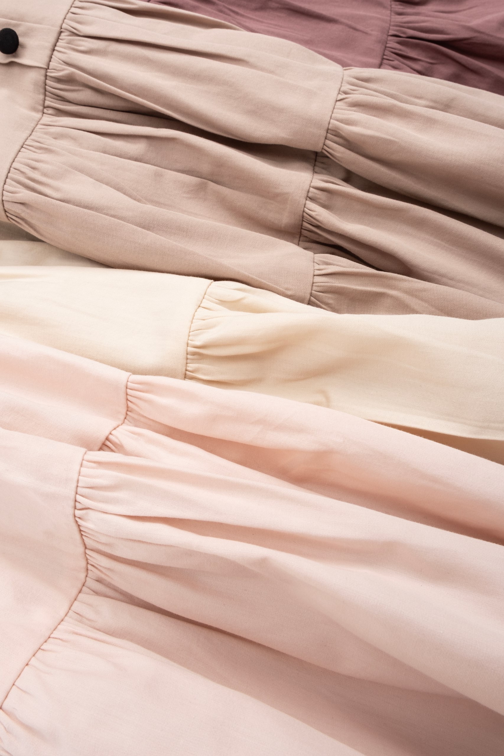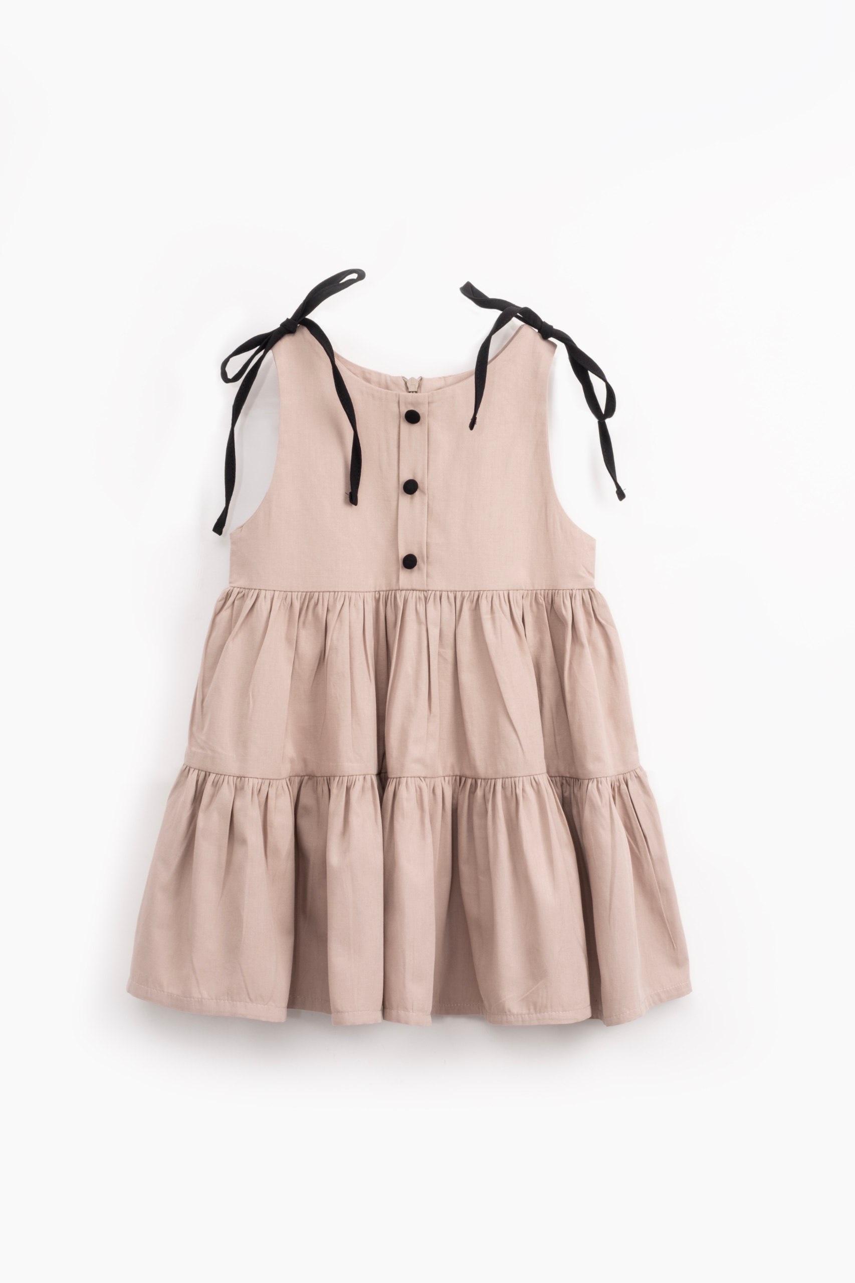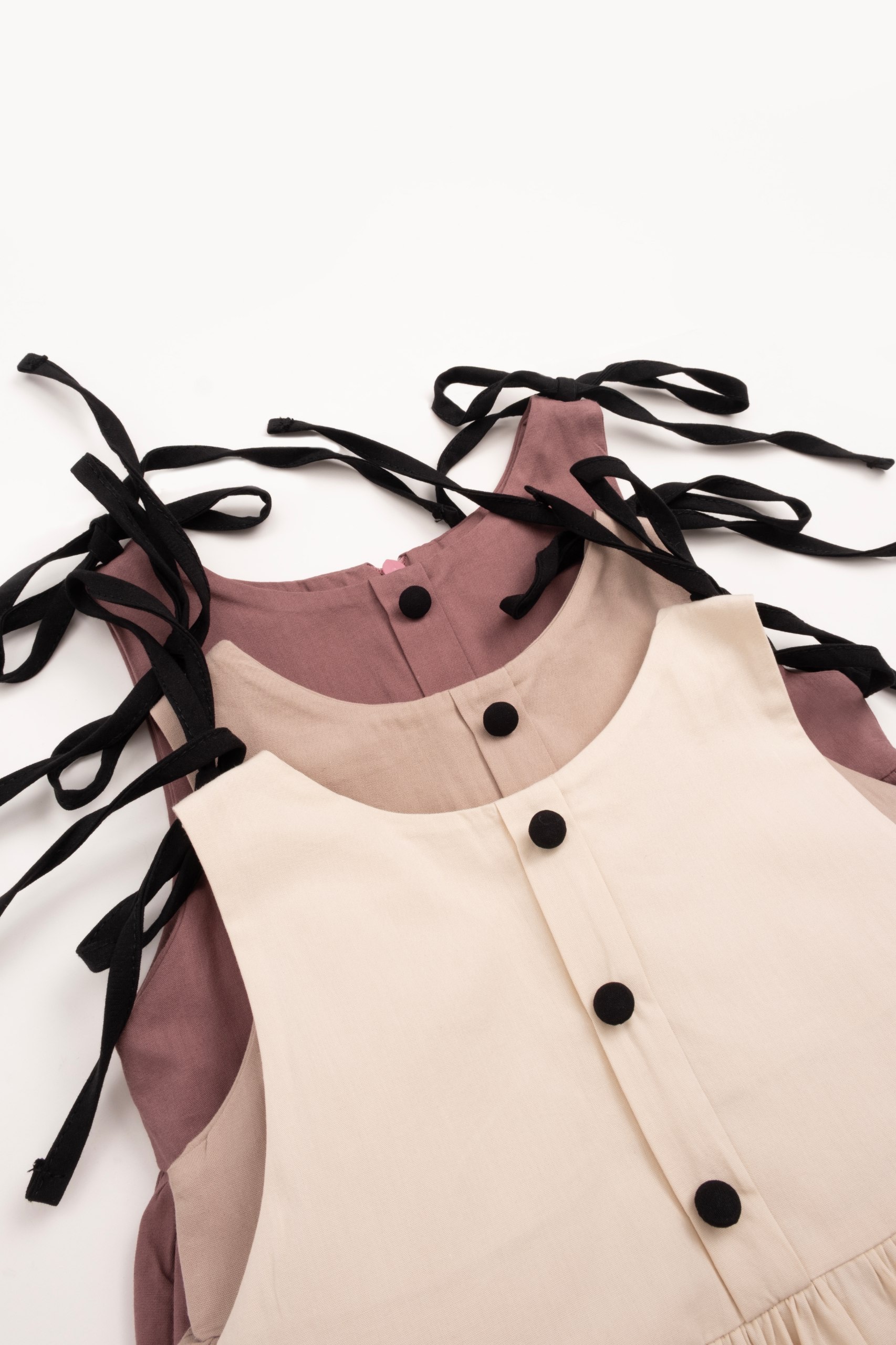 Düğmeli formu, kruvaze yaka hissi ve omuzdan geçen bağcıkları ile çok şık ve özgün bir tasarım. Renk tonu ve kumaş yapısı ile tam bir “bohem elbise” havasında.